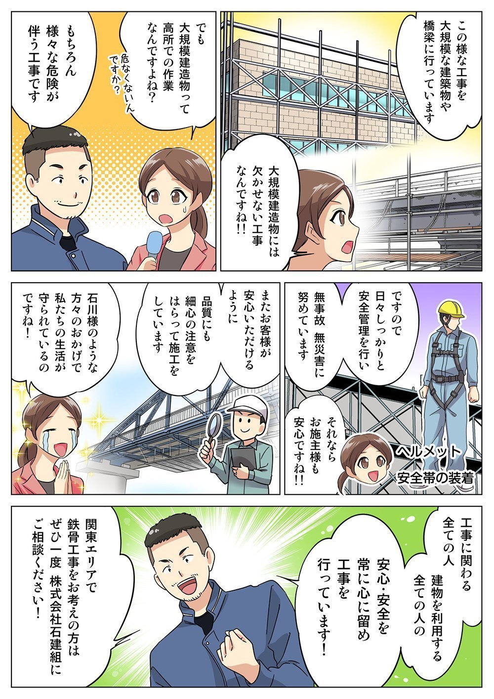 代表の石川は、この道約20年以上のベテランです。その他のスタッフも豊富な経験を有しており、安定して高品質な施工がご提供できます。建築物のスタートともいえる鉄骨工事、重量物を扱うプラント工事とも、安心してお任せください。